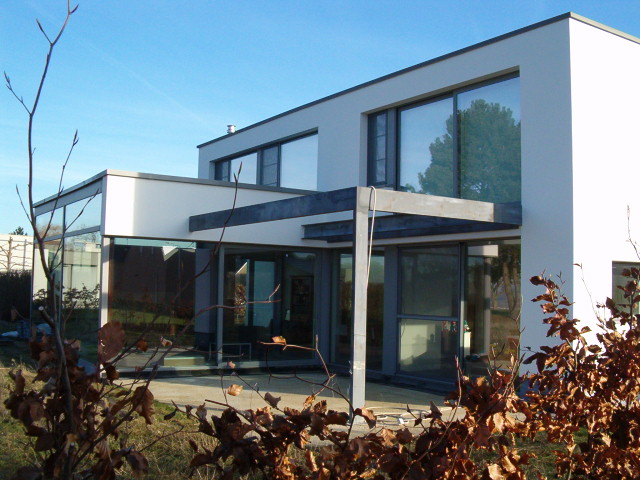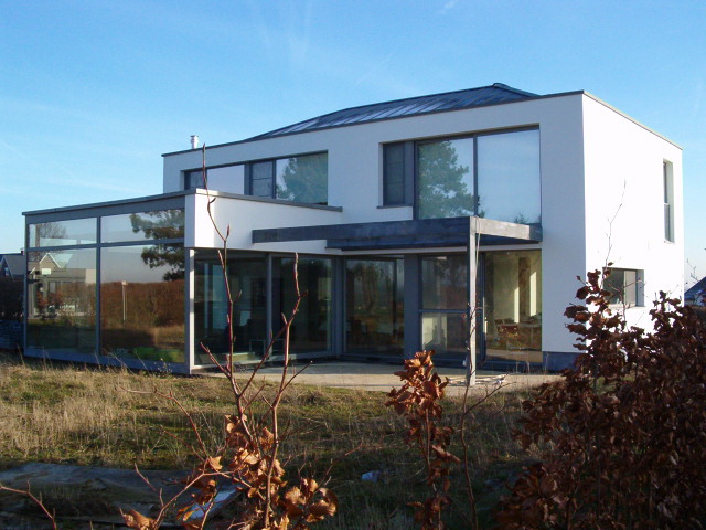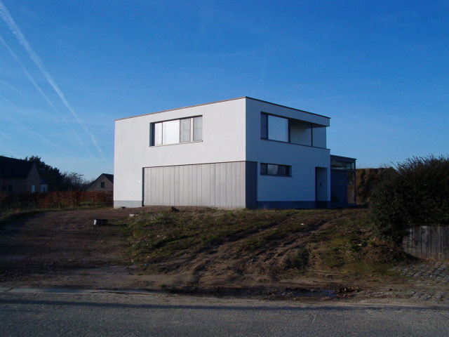 De woning is gelegen in een scherpe bocht van een zijstraat aan de drukke verbindingsweg tussen Leuven en Tienen. Juist daar waar nogal wat auto's versnellen of sterk afremmen. Door de voorgevel van deze woning in het verlengde te leggen van de gevels aan de rechterkant van de woning, vindt ze enerzijds toenadering tot de bestaande vrijstaande woningen en sluit ze anderzijds de huizenrij af. Tegelijkertijd zorgt deze inplanting ervoor dat de woning wat afstand neemt van het voorbij razende verkeer. De volumetrie van de woning is eenvoudig en strak. Mede door de woning voor- en achteraan gedeeltelijk te voorzien van een plat dak, blijft het (verplichte!) piramidedak van het hoofdvolume grootendeels uit het oog. Aan de tuinzijde van het gelijkvloers vormen zithoek, eethoek en keuken één open ruimtelijk geheel. Een variatie in plafondhoogte geeft elke zone zijn eigen identiteit. De functionele ruimtes (o.a. garage, bijkeuken, inkom en toilet) van het gelijkvloers liggen aan de straatkant.