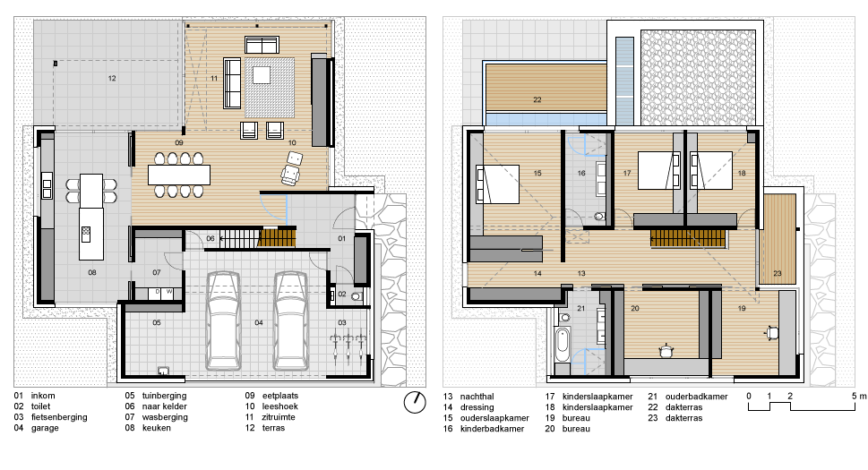 Op de verdieping liggen beide bureau's, de ouderbadkamer en de dressing aan de straatkant.